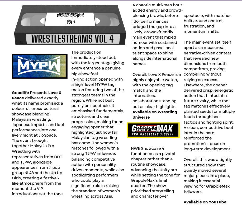 Grapplemax’s Unity show also performed well at The Foo Chow Building a week earlier. More on that event later in the issue. The promotion has not run any shows since, but there was a community event, H4PW, seemingly organised by a group of wrestlers on December 20th. The bizarre show featured cosplaying wrestlers from Grapplemax, MYPW and SPW, including a Remus Birthday Rumble won by Kelvin Lang among other characters. At press time, the promotion had yet to announce its first event of 2026.