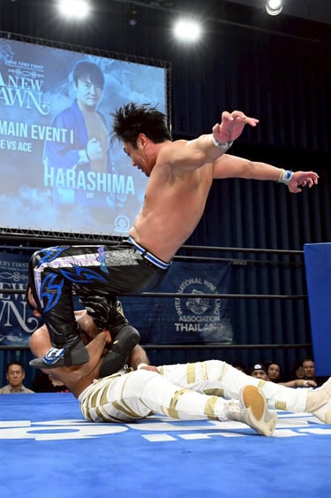 In-ring, the show struck a careful balance between experimentation and clarity. Karuga versus Anot Alonso opened proceedings with an unsettling contrast of styles. Freed from his former pairing with P. Suachart, Alonso leaned further into a cocky, pretty-boy persona, gradually asserting more offence against Karuga’s aggressive, near-demonic presence. The match gave Alonso space to breathe, culminating in a spiraling slam that earned a great reaction and suggested his singles evolution is very much on track.