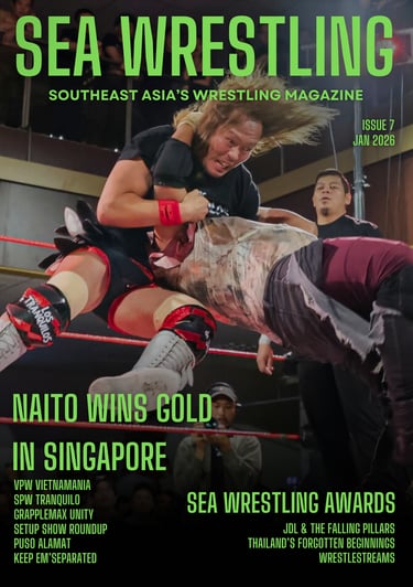 SEA Wrestling Issue 7 covers a pivotal period across Southeast Asia, featuring VPW Vietnamania, SPW Tranquilo, Grapplemax Unity, SETUP’s year-end run, and Puso Alamat. The issue also includes the 2026 SEA Wrestling Awards, regional analysis, and a deep dive into the origins of professional wrestling in Thailand.